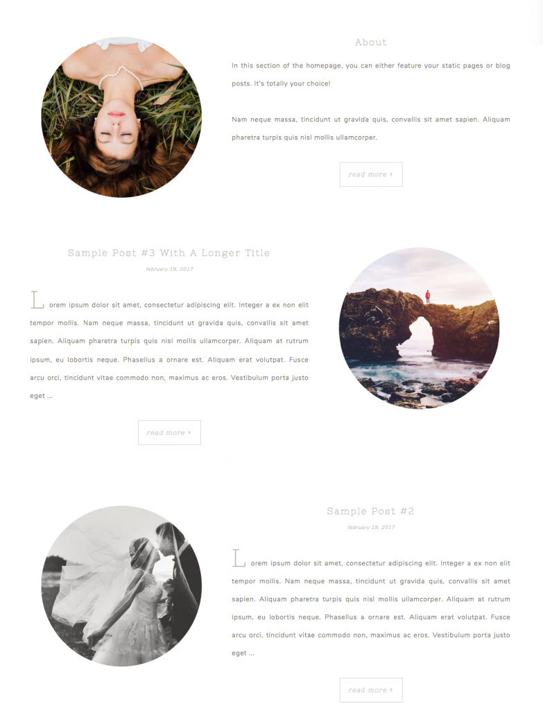 There are essentially three sections, each broken into a left and right part. One part features an image, and the other part features text/an excerpt. You can feature either posts or pages (or both) here.